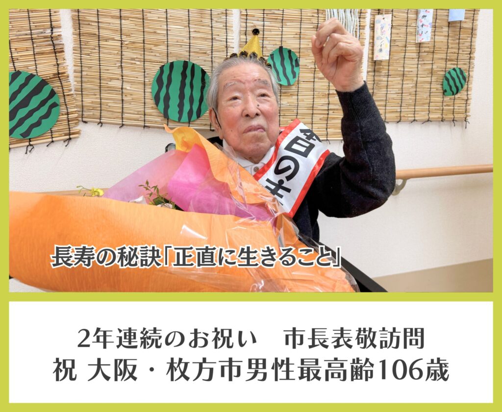 2025年9月8日(月)大阪・枚方市男性最高齢の106歳を迎えた坂谷正勝さんのお祝いのため、