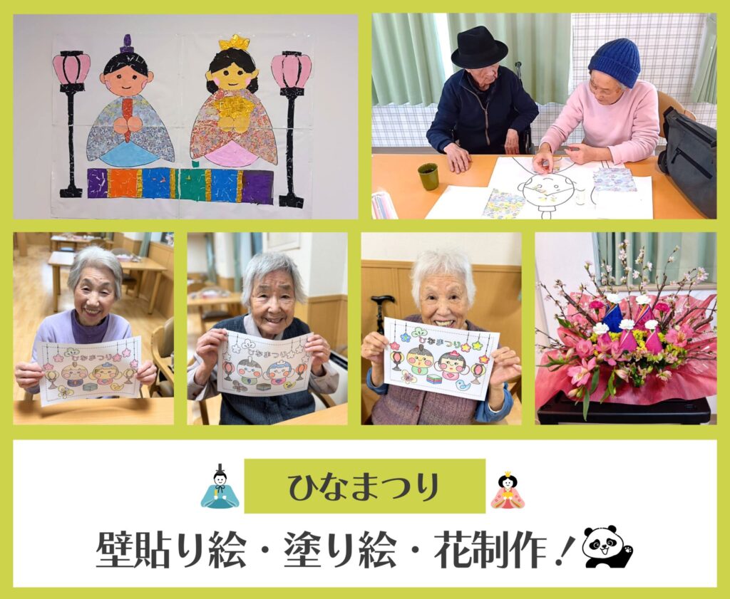 先日、「ひなまつり」にちなんだ、壁貼り絵・塗り絵・花制作を行いました。