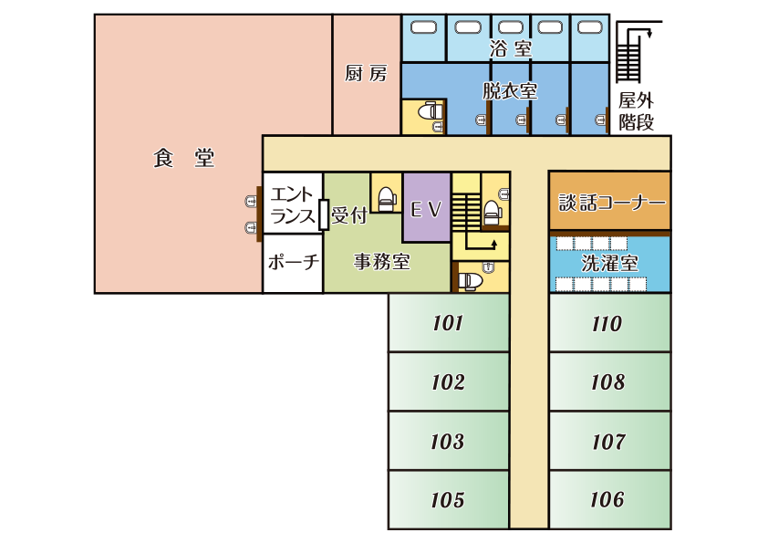 | 設備 | ナースコール・トイレ(ウォシュレット付き) 洗面(温水)・クローゼット・キッチン・エアコン 照明 |