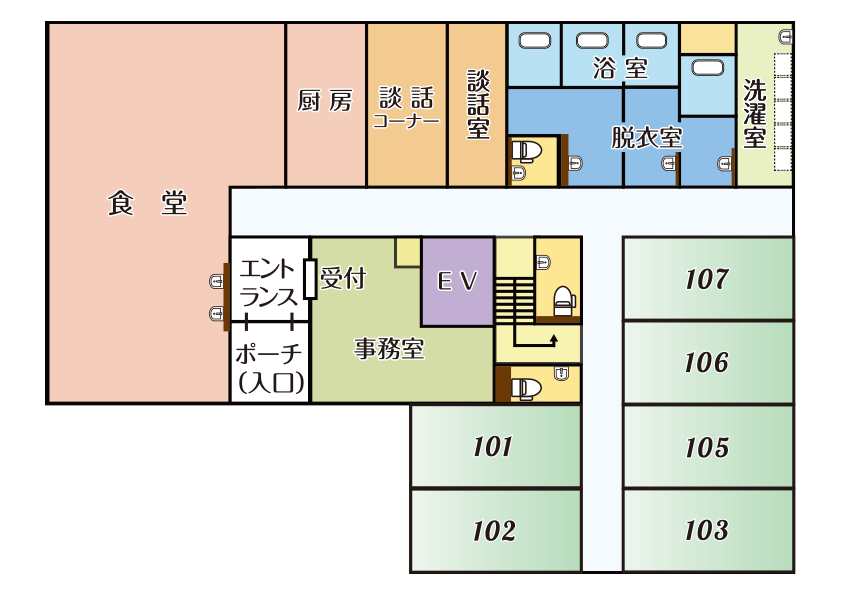 | 施設内設備 | 浴室(個浴2室/機械浴1室/ストレッチャー浴1室)・脱衣室・共用トイレ |