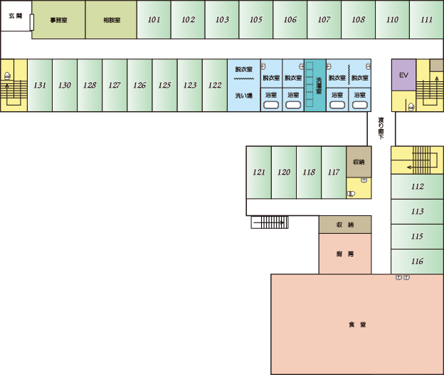 | 施設内設備 | 浴室(個浴2室/機械浴2室/ストレッチャー浴1室)・脱衣室・共用トイレ |